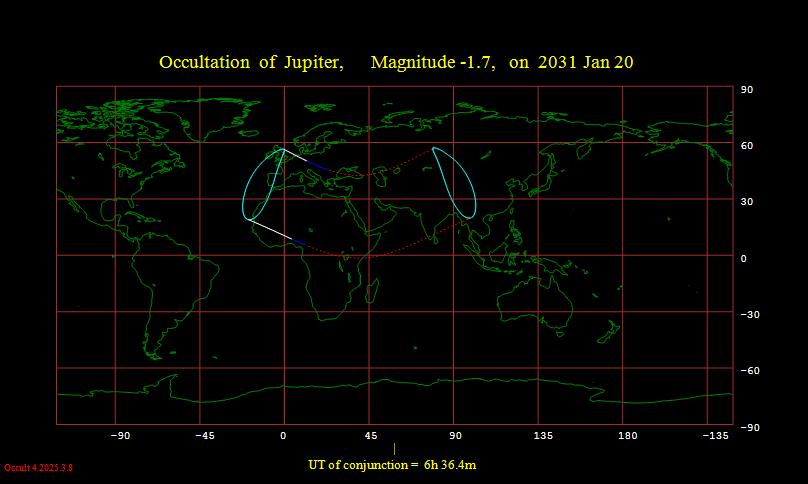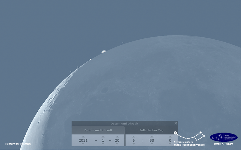 In den Morgenstunden des 20. Jänner 2031 kommt es zu einer streifenden Bedeckung des Planeten Jupiter durch den Mond.