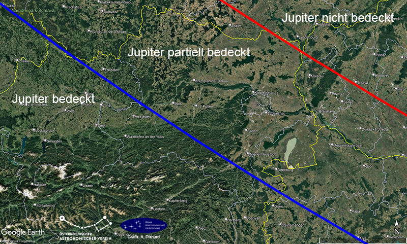Es handelt sich um eine streifende Bedeckung. Nördlich einer Linie, die im Weinviertel in etwa der Grenze zu Tschechien entspricht, findet keine Bedeckung statt. Südlich einer Linie, die vom Mühlviertel ins Mittelburgenland verläuft, wird Jupiter zur Gänze bedeckt. Dazwischen, inklusive Wien, wird Jupiter partiell bedeckt.
