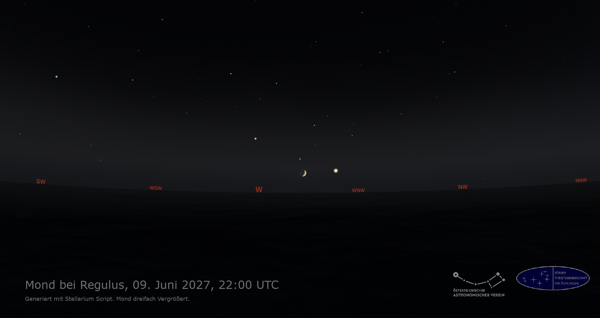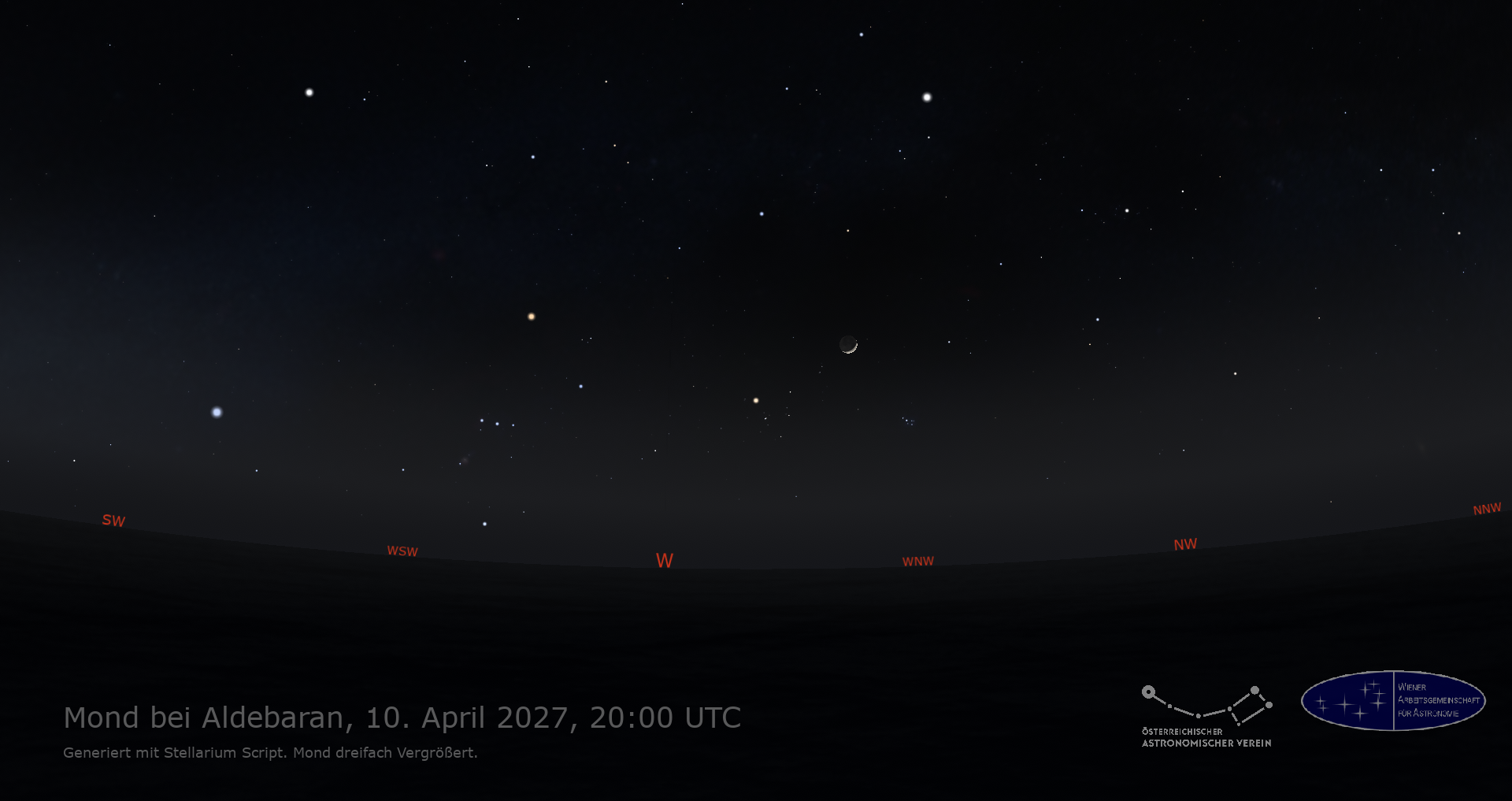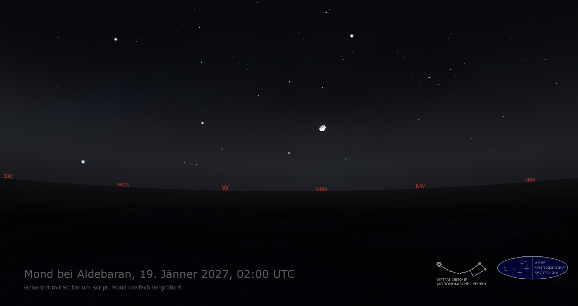 Ausgewählte Begegnungen des Mondes mit den hellen Sternen und Planeten im Jahr 2027.