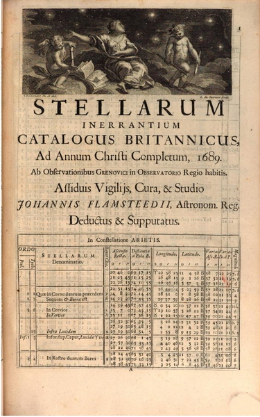 John Flamsteed (1646-1719) war ein englischer Astronom und der erste Astronomer Royal (Königlicher Astronom). Er wurde 1675 von König Charles II. ernannt und war für die Erstellung eines genauen Sternenkatalogs und -atlas verantwortlich, um die Navigation zu verbessern. 1675 legte er auch den Grundstein für das berühmte Royal Greenwich Observatory. Seine wichtigsten Werke wurden erst nach seinem Tod veröffentlicht: Der Katalog Historia coelestis Britannica 1725 und der Sternatlas Atlas coelestis 1729.