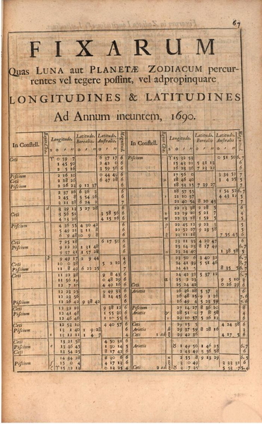 Aus dem dritten Band der Historia coelestis Britannica, der den Sternkatalog enthält. Quelle: archive.org/details/historia-coelestis-britannica-vol-3, Bayerische StaatsBibliothek, Münchener DigitalisierungsZentrum Digitale Bibliothek In dem Sternkatalog verzeichnet Flamsteed im Dezember 1690 einen Stern an der Position Rektaszension 55°47'30", Poldistanz 70°25'05" (Äquinoktium 1690, Poldistanz = 90°-Deklination).