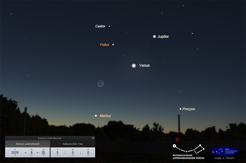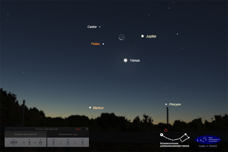 Besonders reizvoll wird diese Morgenkonstellation, in die auch die Hauptsterne der Zwillinge, Castor und Pollux, einbezogen werden, wenn die dünne Sichel des abnehmenden Mondes ebenfalls in dieser Region steht. Dies ist am 20. und 21. August der Fall.