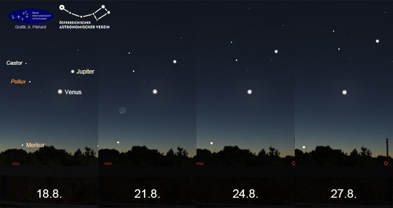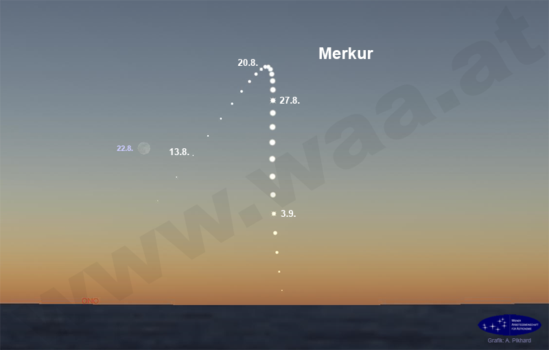 Die zweite Morgensichtbarkeit von Merkur in diesem Jahr ist die beste und erreicht ihren Höhepunkt in der dritten Augustwoche. Bis in die erste Septemberwoche kann der sonnennahe Planet im Ostnordosten gesehen werden. In dieser Morgensichtbarkeit bildet Merkur mit Venus und Jupiter (nach deren markanter Begegnung) ein auffälliges Planetentrio, das auch gut die Lage der Ekliptik erkennen lässt.