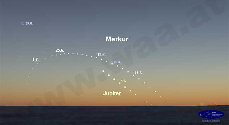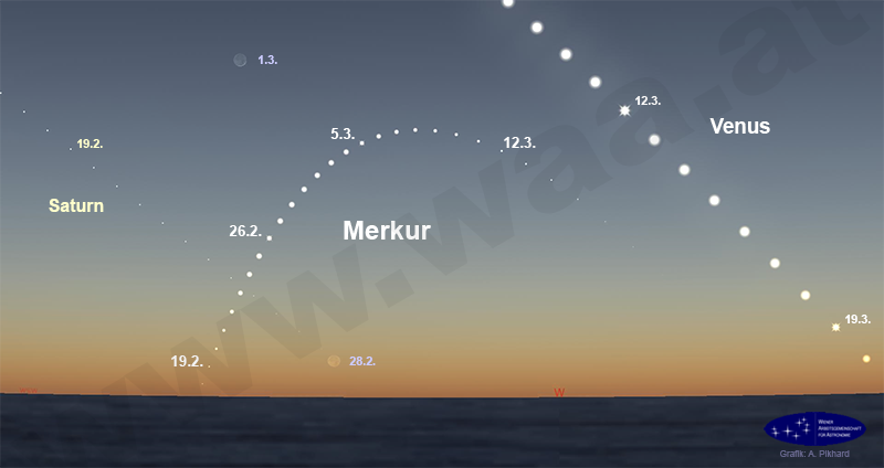 Die beste Abendsichtbarkeit des Merkur im Jahr 2025 beginnt in der dritten Februarwoche Vor allem in der letzten Februar- und ersten Märzwoche steht Merkur günstig in der Abenddämmerung im Westen. Venus am Ende ihrer Abendsichtbarkeit ist nur zum Ende dieser Merkursichtbarkeit hin eine Hilfe. Abendsichtbarkeit, Juni/Juli 2025