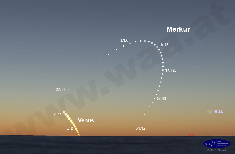 In der ersten und zweiten Dezemberwoche erreicht die letzte Morgensichtbarkeit des Merkur ihren Höhepunkt. Venus, die ihre Morgensichtbarkeit gerade beendet, ist bei der Suche nach Merkur in der Morgendämmerung im Südosten nicht mehr von Hilfe. Die Grafiken wurden mit speziellen Skripten für Stellarium (www.stellarium.org) erstellt.