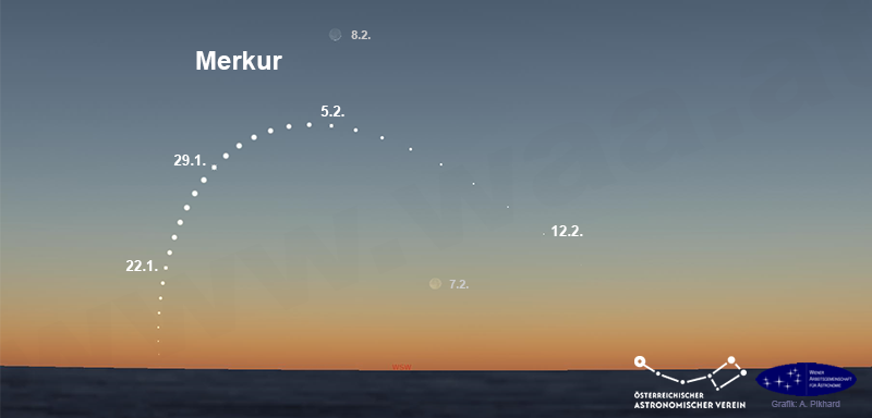 Merkur zeigt 2027 in Mitteleuropa zwei Abend- und zwei Morgensichtbarkeiten. Alle vier Sichtbarkeiten sind günstig. Morgensichtbarkeit, Jänner/Februar 2027