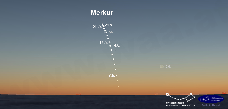 Die erste gute Abendsichtbarkeit Merkurs in diesem Jahr erreicht ihren Höhepunkt in der dritten und vierten Jännerwoche, in der der sonnennahe Planet im Westnordwesten zu finden ist. Leider hilft kein anderer heller Planet bei der Orientierung, lediglich der junge Mond am Ende der ersten Februarwoche schon gegen Ende der Sichtbarkeit. Abendsichtbarkeit, Mai 2027