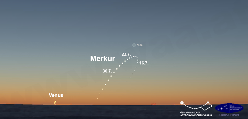 Die zweite Abendsichtbarkeit des Merkur in diesem Jahr ist die beste. Ihren Höhepunkt erreicht sie in der letzten Maiwoche. Es hilft kein anderer heller Planet beim Auffinden des Merkur im Nordwesten. Morgensichtbarkeit, Juli/August 2027
