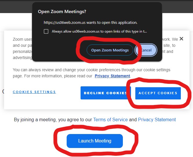 Um an dem Workshop oder Kurs teilzunehmen, öffenen Sie einige Minuten vor Beginn den im Mail bekanntgegebenen Link zum Zoom Meeting in einem Internet-Browser Ihrer Wahl. Bei der ersten Teilnahme müssen Sie dem Browser erlauben, auf Ihr Mikrofon und Ihre Kamera zuzugreifen. Dies ist für eine erfolgreiche Teilnahme notwendig. Im nächsten Schritt müssen Sie Ihrem Gerät erlauben, an einem Zoom Meeting teilzunehmen. Dazu erlauben Sie, Zoom Meetings zu öffnen, akzeptieren bitte die hierfür erforderlichen Cookies und starten schließlich das Meeting (Launch Meeting).