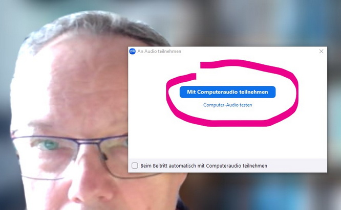 Danach startet das Meeting (Kurs bzw. Workshop) in ihrem Browser. Sie müssen dem Meeting jetzt noch gestatten, Ihre Audiogeräte zu verweden ("Mit Computeraudio teilnehmen"). Verwenden Sie im Zweifelsfall den Link "Computer-Audio testen", um sicherzustellen, dass Mikrofon und Lautsprecher bzw. Kopfhörer einwandfrei funktionieren.